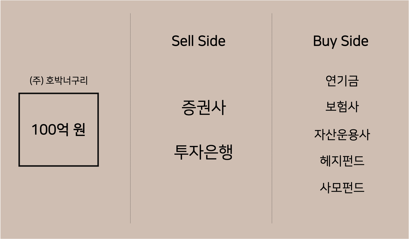 우선 '(주)호박너구리'라는 기업이 있다고 가정합시다. 현재 (주)호박너구리는 사업을 확장하기 위해 100억 원의 자금이 필요합니다. 그런데 (주)호박너구리는 사업에 집중하기도 바쁜 상황이죠. 이럴 때 기업은 보통 증권사나 투자은행의 IBD(투자 은행 부서, Investment banking division)에 연락합니다. 이들은 기업이 자금을 조달하기 위한 방법(ex. 주식, 채권, 대출 등을 어떻게 활용하면 될지)을 상담해줍니다. 그리고 기업의 의뢰를 매력적으로 보이도록 만들어서 투자자를 찾아다니며 발표를 하죠.