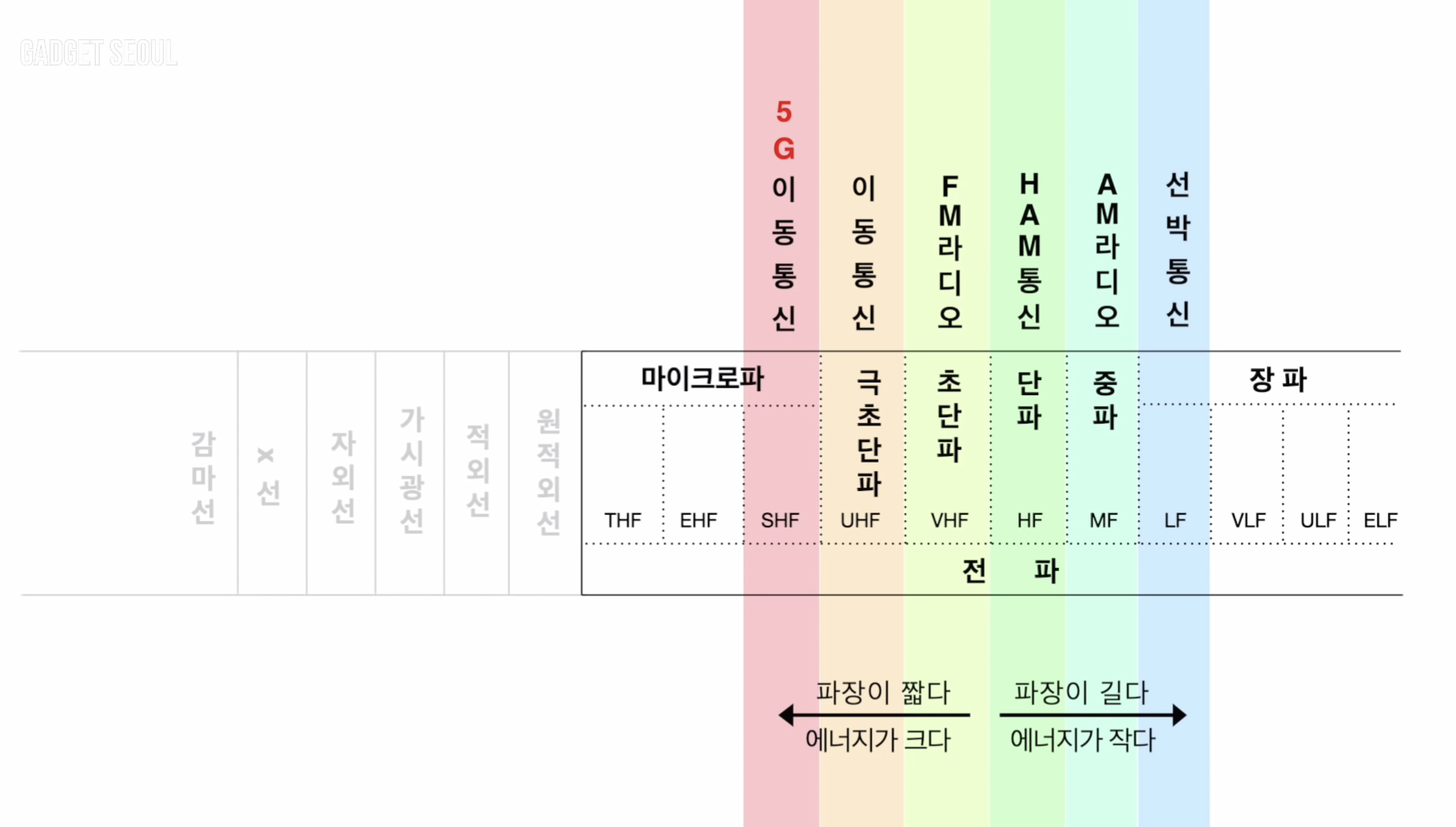 주파수에 대해 잘 모르시는 분들도 있을 수 있어서 간단히 설명드리자면 다음과 같습니다. 빨강부터 보라까지 눈에 보이는 전자기파를 가시광선이라고 하죠. 보라색에 가까울수록 파장이 짧고 고에너지인데요, 가시광선보다 에너지가 큰 파장으로는 자외선, X선, 감마선이 있습니다. 우리가 이동통신에서 사용하는 파장은 그 반대편에 있는 파장으로 에너지가 약해서 인체에 무해합니다. 위의 이미지를 보시면 파장의 상대적 위치에 대해 보다 쉽게 이해하실 수 있을 것입니다.