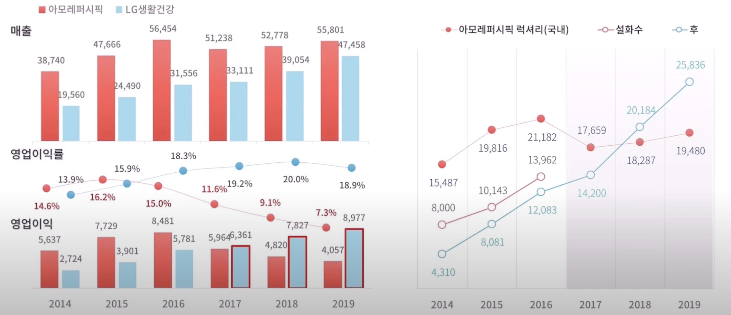 2016년에 세계 뷰티기업 7위에 선정된 아모레퍼시픽은 2016년 이후로 영업이익에 있어서 아쉬운 모습을 보여주고 있습니다. 2016년에 매출 5조 6천억원, 영업이익 8400억원(영업이익율 15%)을 달성한 이후, 국내 매출이 하락하고 광고 비용이 증가하여 2019년에는 매출 5조 5천억원, 영업이익 4000억원(영업이익율 7.3%)을 기록했습니다.