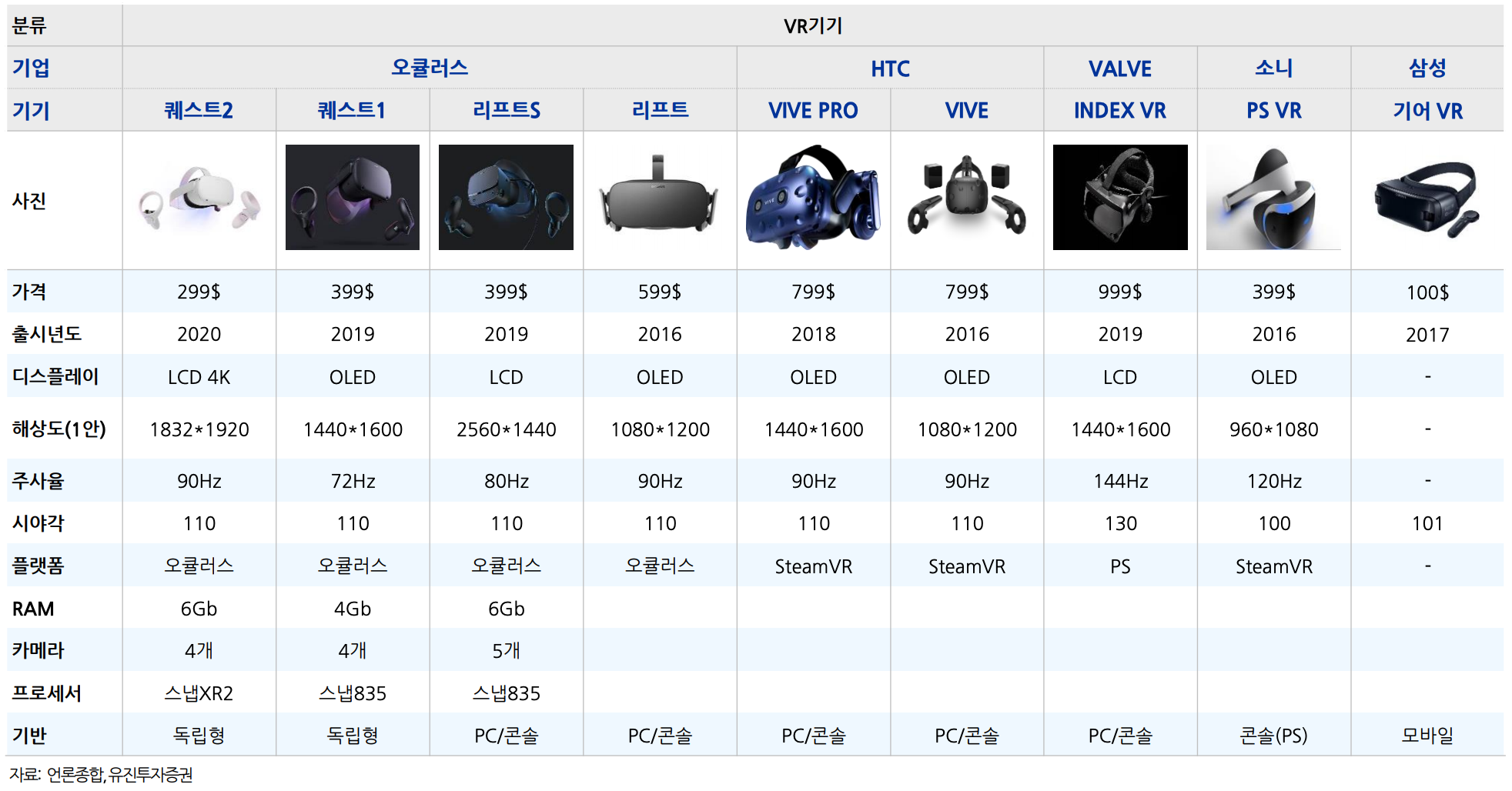 메타버스 생태계의 디바이스는 보통 VR과 AR 기기인데요, 가상 현실이 각광을 받은 이후 2010년대 중반부터 많은 기업들이 관련 디바이스를 출시해왔습니다. 대표적으로 소니는 콘솔 기반의 플레이스테이션 VR을 2016년에 출시($399)했고, 삼성은 2017년에 모바일 기반 기어VR($100)을 출시했으며, HTC는 2016년과 2018년에 각각 VIVE($799)와 VIVE PRO($799) 제품을 선보였습니다. 그러나 적지 않은 기업들이 이후 수익성을 이유로 제품을 출시하지 않게 되었는데요, 그들과 달리 페이스북(오큘러스)은 꾸준히 투자를 이어오며 현재 이 시장에서 가장 유력한 기업으로 떠오르게 되었습니다.